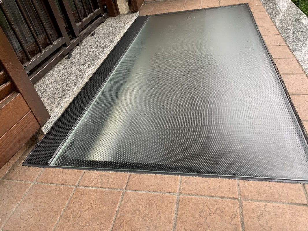 Villa privata a Triuggio, realizzazione bocche lupaie in cristallo calpestabile extrachiaro temprato antiscivolo con griglia in lamiera microforata verniciata a polvere e scolo acqua.