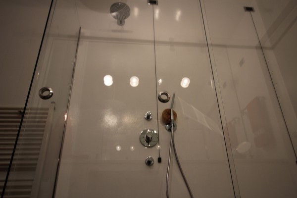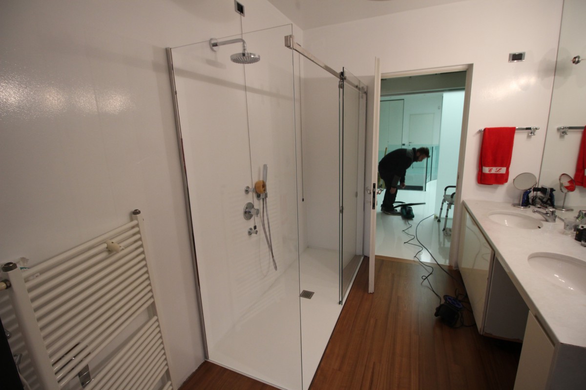 Box doccia scorrevole Villa Meda, realizzazione box doccia scorrevole muro vetro con parete fissa e doppia maniglia.