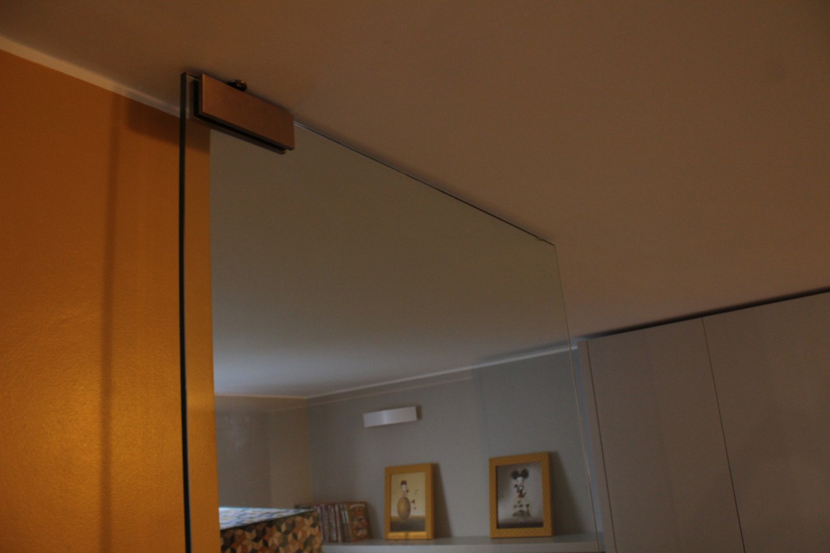 Pareti e porte divisorie Villetta a Milano, chiusura spazio camere con pareti fisse e porte in cristallo 10mm temprato.