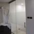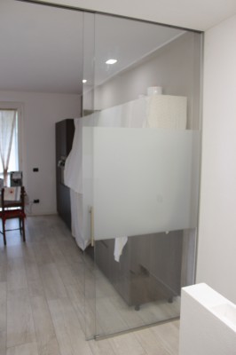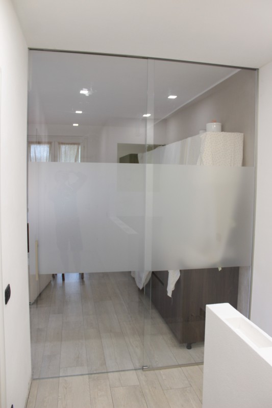 Porta scorrevole in Cristallo extrachiaro con striscia privacy satinata.